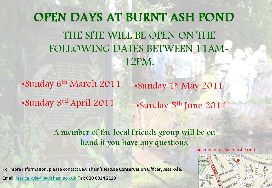 OPEN DAYS AT BURNT ASH POND Posted on February 28, 2011February 28, 2011 by Jess kyle Share this: Click to share on X (Opens in new window) X More Click to share on Facebook (Opens in new window) Facebook Click to share on Tumblr (Opens in new window) Tumblr Like Loading... Related