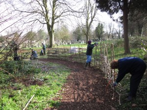 A merry bunch of nature’s Gym voluteers braved the chilly weather on Saturday 5th March to improve one of the footpaths in Ladywell and Brockley Cemeteries. They started by cutting back some of the bramble to widen the path a little. They then created a hurdle fenace at the start of the path and laid woodchip, this was so that the path had greater definition.