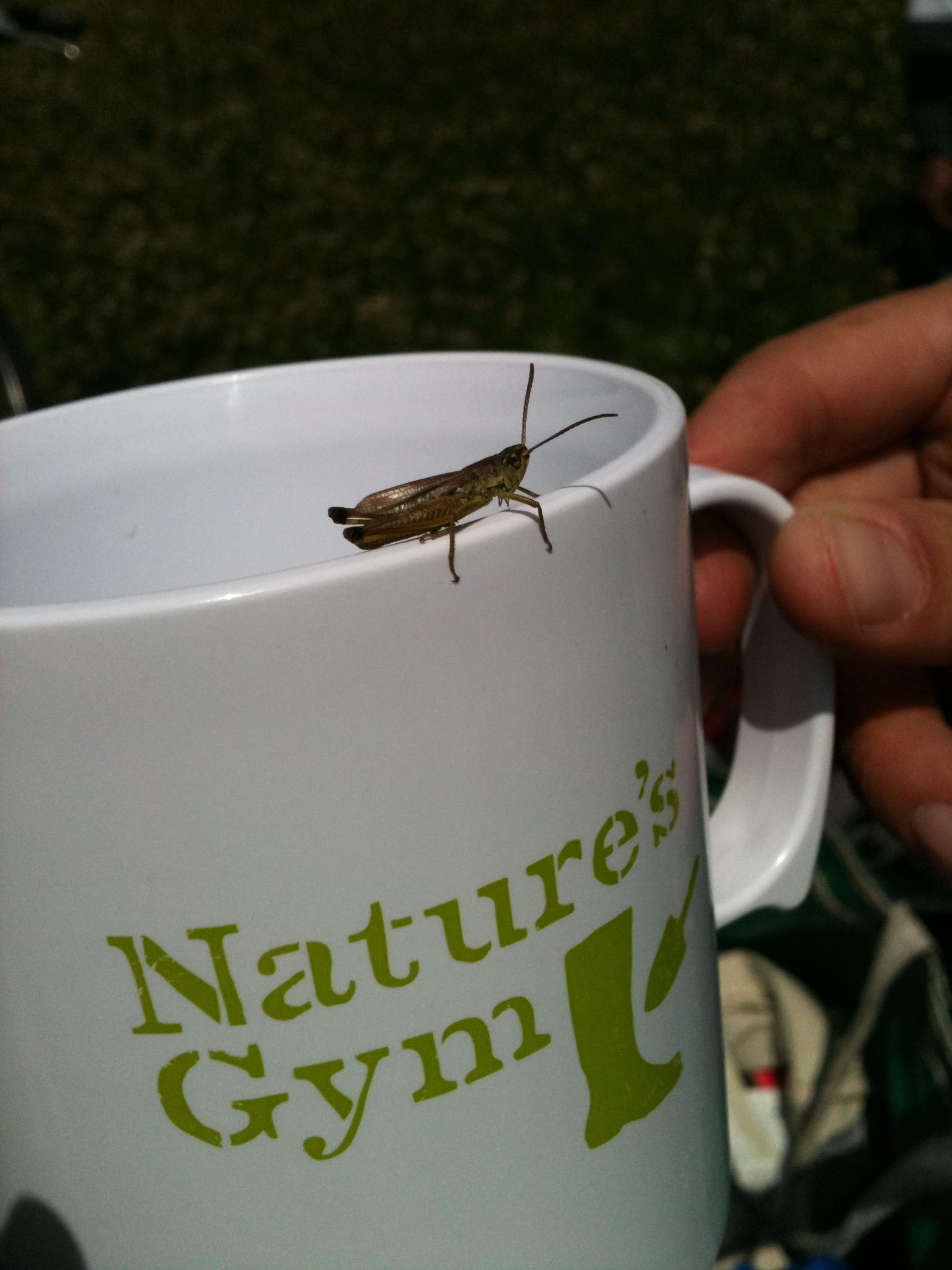 While working at Hilly Fields pulling creeping thistle last week the Nature’s Gym volunteers came across a number of bugs, including a meadow brown and cabbage white and numerous grasshoppers and crickets. At the midday tea break one got a little closer to the tea than most. It seemed as though it was a tea drinker, but we had sadly run out of ginger biscuits to go with it!