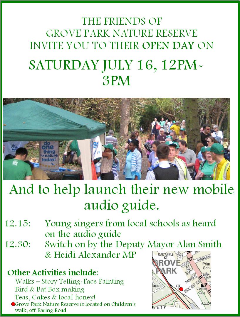 The Friends of Grove Park are happy to announce the launch of their new audio guide. This will take place on Saturday 16 July from 12pm-3pm. The lead you around the reserve, stopping at certain points, where you will learn more information. This has only been made achievable through the hard work and dedication of the Friends and Stephen Kenny.