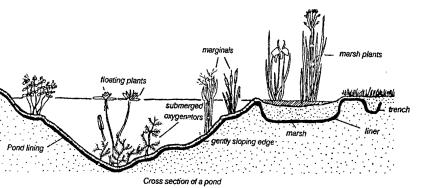 Marginal plants need to grow at the shallow edges of the pond. Some need to be permanently in a few centimetres of water, while others will tolerate periodic drying out.