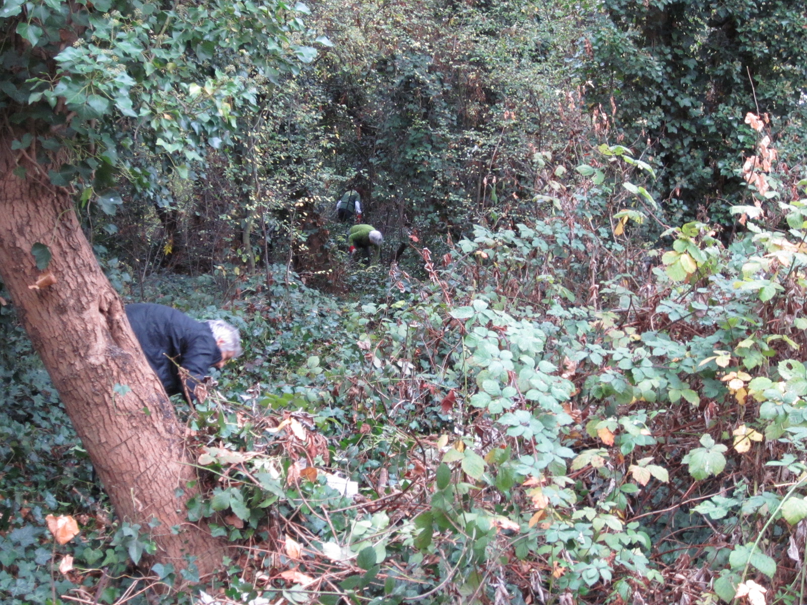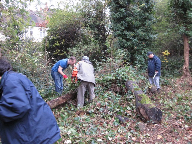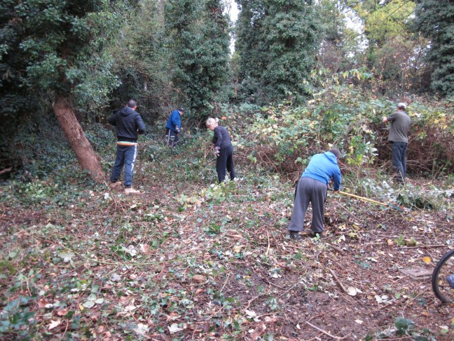 So thanks to a successful bid to the Mayor’s Fund work has started on turning this old site in to a viable orchard. On Thursday 3 November the Ladywell Fields User Group along with volunteers from Nature’s Gymset to work clearing the site to allow access for the initial tree works. This is the first of a number of volunteer sessions that will seek to improve the site as a nature reserve, in accordance with the Council Ecology Officer’s management plan for the site. For example the old fruit trees need considerable maintenance (some may need professional felling), a simple fence needs to be erected, and a pathway around the site needs to be laid/built.