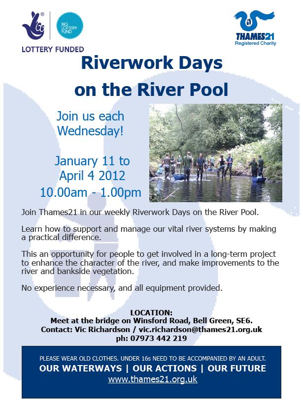 River Days on the River Pool Posted on January 13, 2012January 13, 2012 by Jess kyle Join Thames21 in their weekly riverwork days on the River Pool. Please see the poster below or get in contact with Vic Richardson Join in the fun with Thames21! Share this: Click to share on X (Opens in new window) X More Click to share on Facebook (Opens in new window) Facebook Click to share on Tumblr (Opens in new window) Tumblr Like Loading... Related