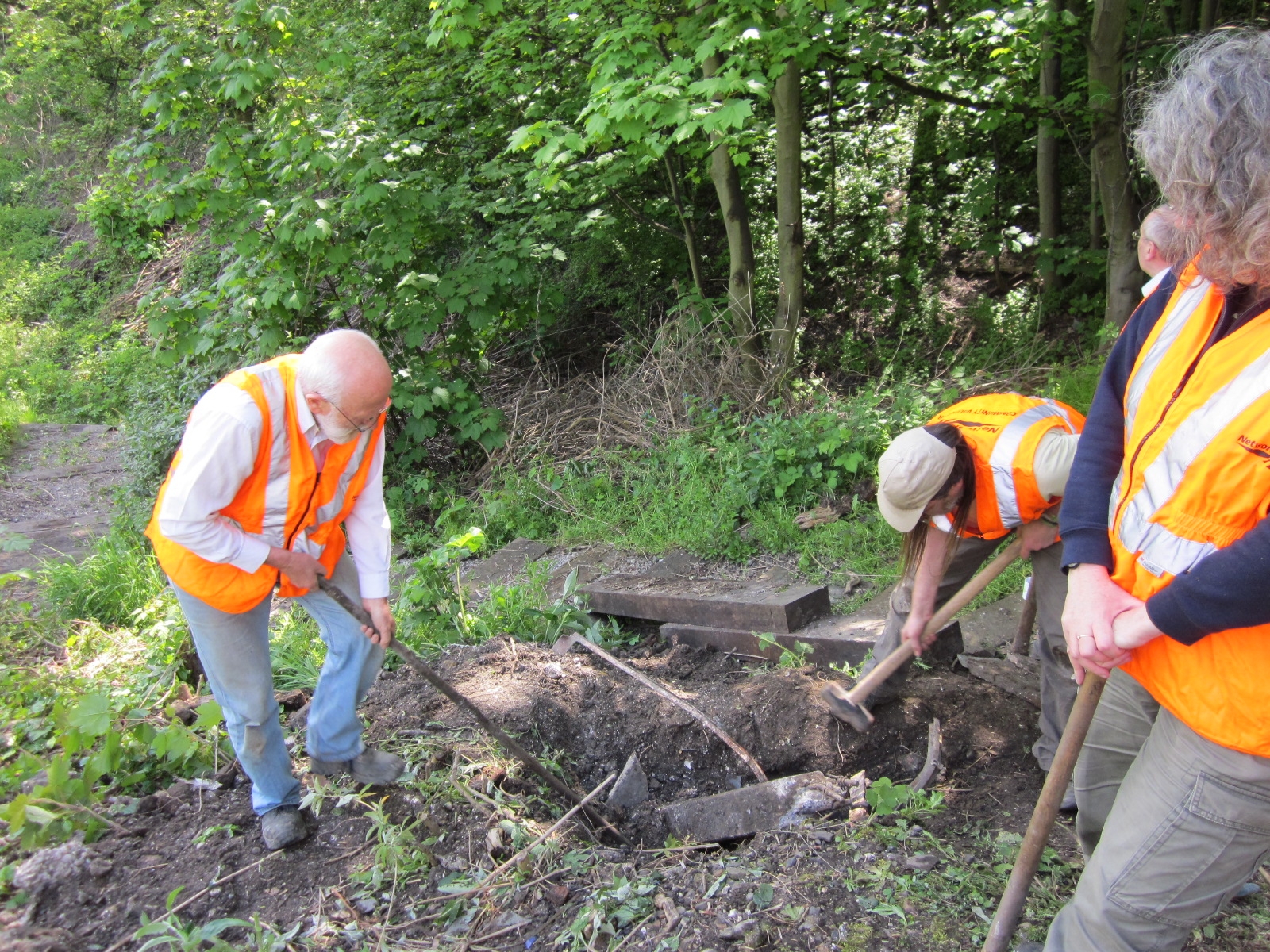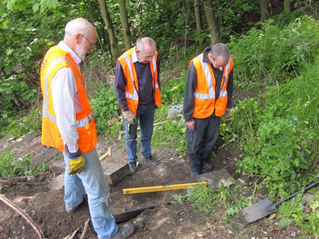 On a glorious Saturday in May, the Friends of Hither Green Triangle made attempts to finish the steps up to platform 5. The last few times we were there it was pouring, so this was a welcome break! With mattocks, spades and a level in hand we set of ready to tackle this task. Unfortunately, we were thwarted by a window!