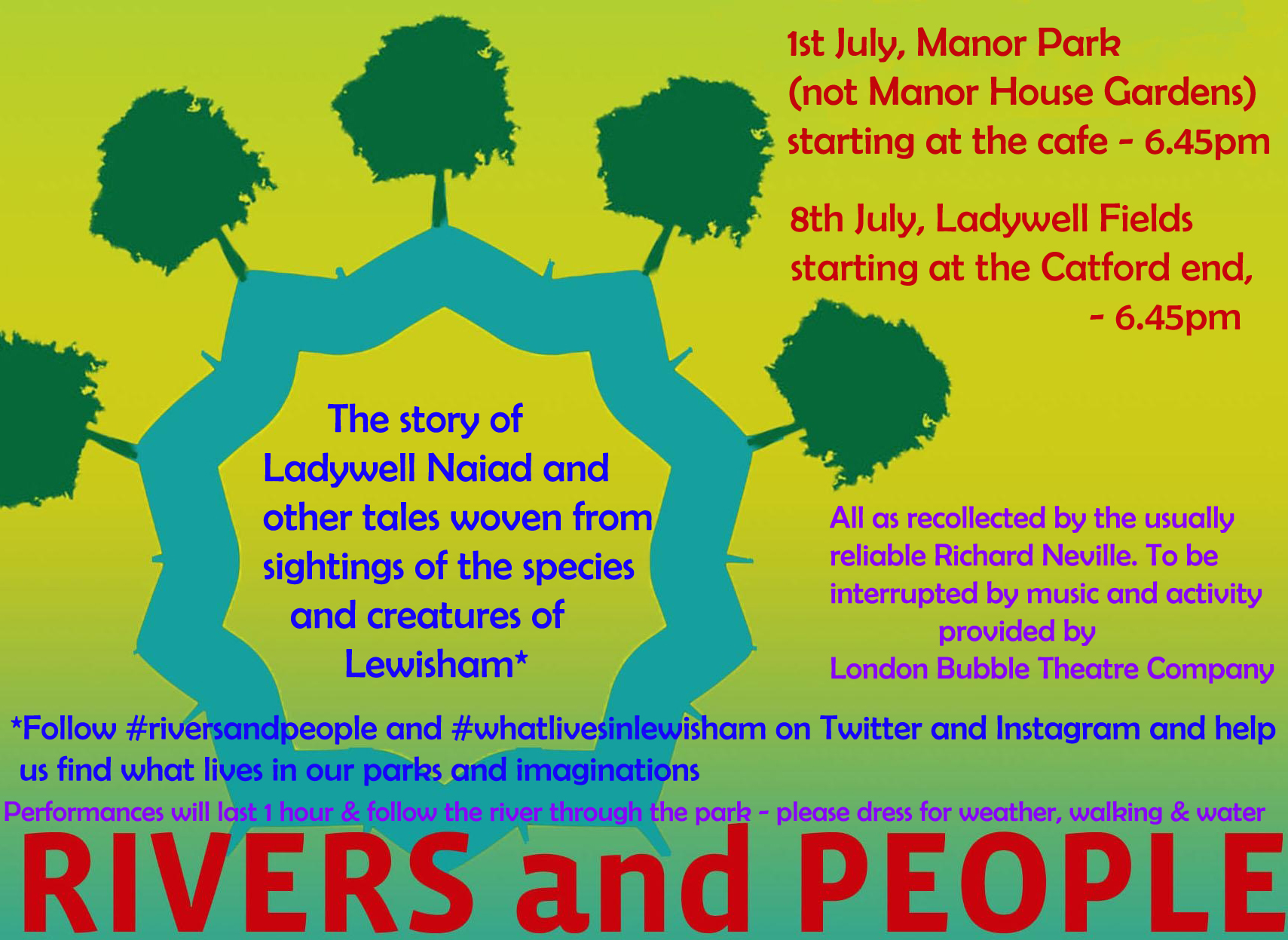 As part of this years 3RiversCleanUp London Bubble will be telling stories in the river. Hear about the Ladywell Naiad and other tales based on the species and creatures of Lewisham. Why not take part by taking a ‘species selfie’ using the #riversandpeople and #whatlivesinlewisham and post them on Twitter or Instgram.