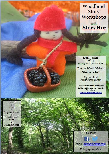 Woodland Story Workshops with StoryHug Posted on September 3, 2015 by nkpond 10-12pm Friday 18th September 2015 Dacres Wood £5 per child all ages welcome info@storyhug.com Share this: Click to share on X (Opens in new window) X More Click to share on Facebook (Opens in new window) Facebook Click to share on Tumblr (Opens in new window) Tumblr Like Loading... Related