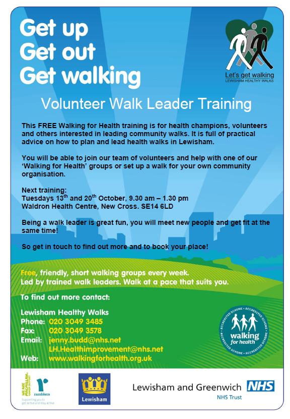 Volunteer Walk Leader training – October 2015 Posted on September 16, 2015September 16, 2015 by Jess kyle For more information on the walks currently being held please visit the Lewisham Healthy Walks page on the Walking for Health website. A printable schedule of walks can be downloaded here. Share this: Click to share on X (Opens in new window) X More Click to share on Facebook (Opens in new window) Facebook Click to share on Tumblr (Opens in new window) Tumblr Like Loading... Related