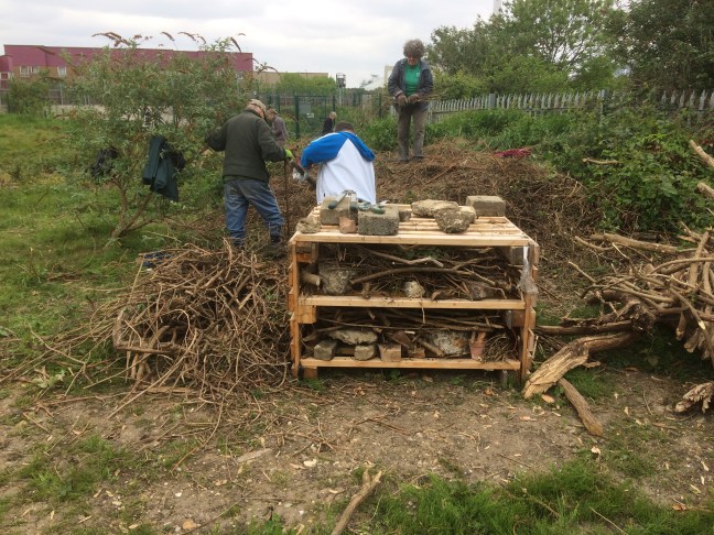The other volunteers got to work creating the bug hotel from bits of brick, rubble and logs found on site, while others created a smaller hibernaculum on the other side of the site with cuttings that had been left on site.
