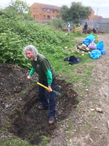 Bridgehouse Meadows is a small site tucked away near John Williams Close. It may not look like much but it does have lots of interesting flora and fauna on site. The Nature’s Gym volunteers have work there a few times and for 2 session in April and May the set to work building a bug hotel and a hibernaculum. This wasn’t our first attempt at creating either a bug hotel or a hibernaculum, but it was certainly the deepest and biggest so far.
