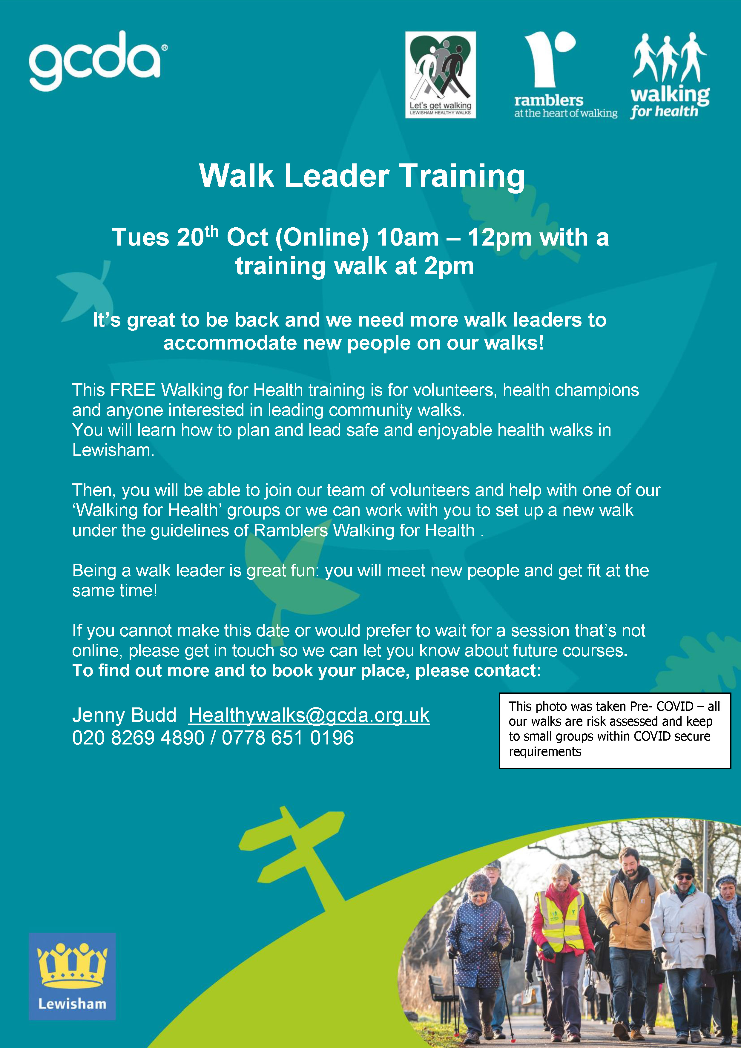 Our Walk Leader training is for anyone willing and able to lead health walks in Lewisham. It is designed by Ramblers Walking for Health and delivered by local ‘cascade trainers’. The aim of the training is to ensure that all walk leaders are trained to a high standard and can competently and confidently lead short, free health walks.