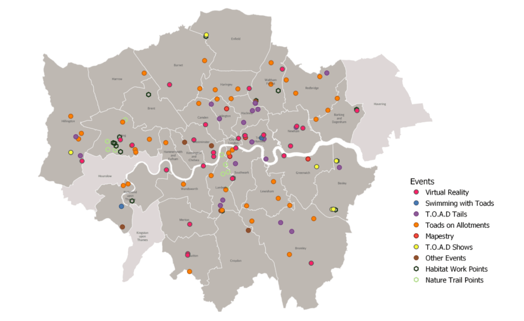 T.O.A.D is a new Froglife project and is supported by the National Lottery Heritage Fund. The project aims to benefit the UK’s beleaguered common toads through a range of engagement and practical conservation activities. They are always keen to hear about sites around London that would be perfect for our activities. If you have a site suggestion or query then please contact Emily, the London project manager. Follow the links on the Froglife website to find out about the different aspects of the project.