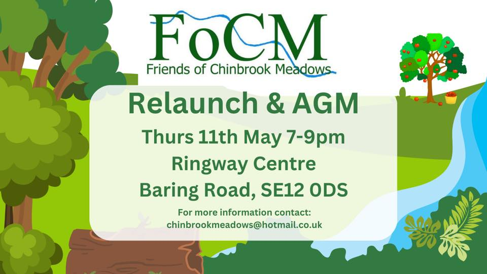 We are really pleased to be able to announce that there will be a re-launch AGM for Friends of Chinbrook Meadows on Thursday 11th May at 7-9pm at The Ringway Centre on Baring Road.