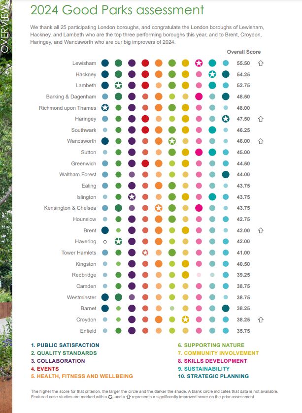The reports also assess how London borough parks services perform against the Good Parks criteria and showcase exemplar work in those ten areas, and this is conducted biennially since 2022. The Good Parks assessment returns in the 2024 report headlined Collaborative Solutions.” (Good Parks for London).